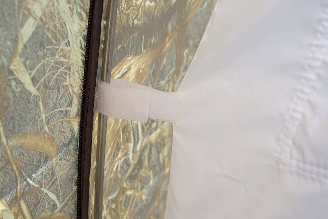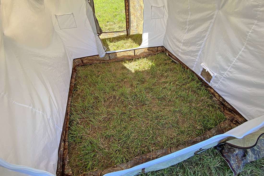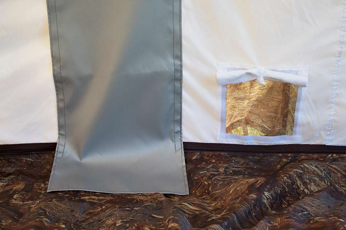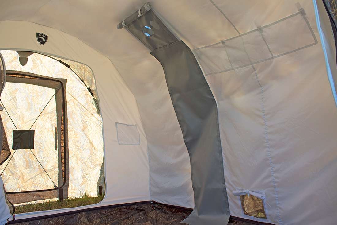 Разделка дымохода, многофункциональное окно, вентиляционное окно, москитные сетки, два входа, пол на молнии, оттяжки со светоотражающими элементами, карманы для хранения на стенках.