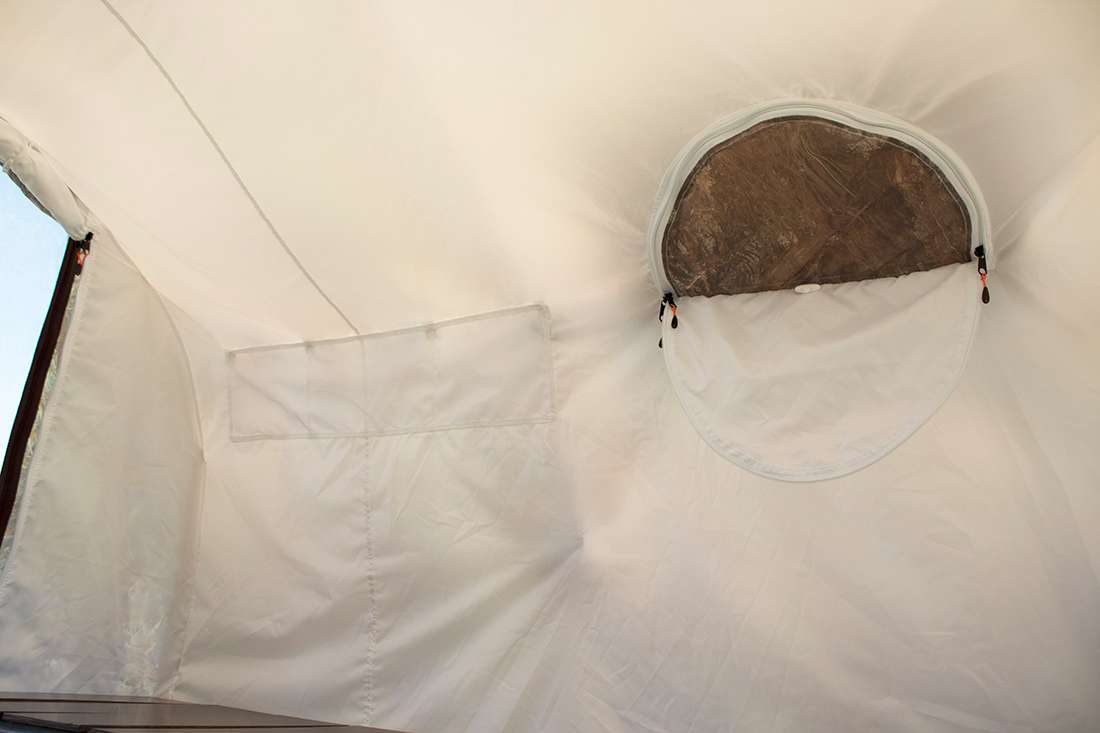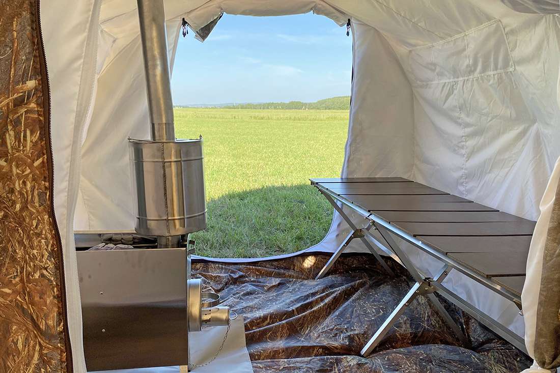 На торцевых стенках предусмотрены входы с москитными сетками. В месте установки печи, стенка защищена термостойкой тканью.