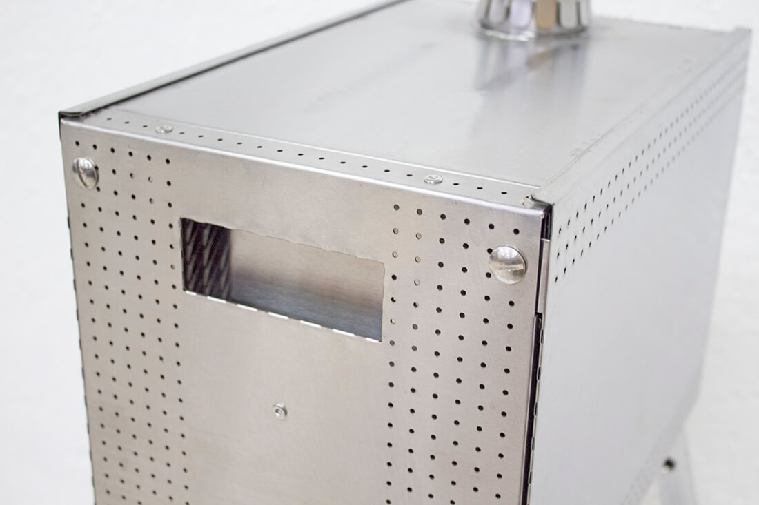 Конструкция: складная со съемными ножками-опорами, защитные экраны с 4 сторон, выдвижные боковые экраны, искрогаситель, дымоход из 7 секций труб + фиксация дымохода, топочная дверка со стеклом.