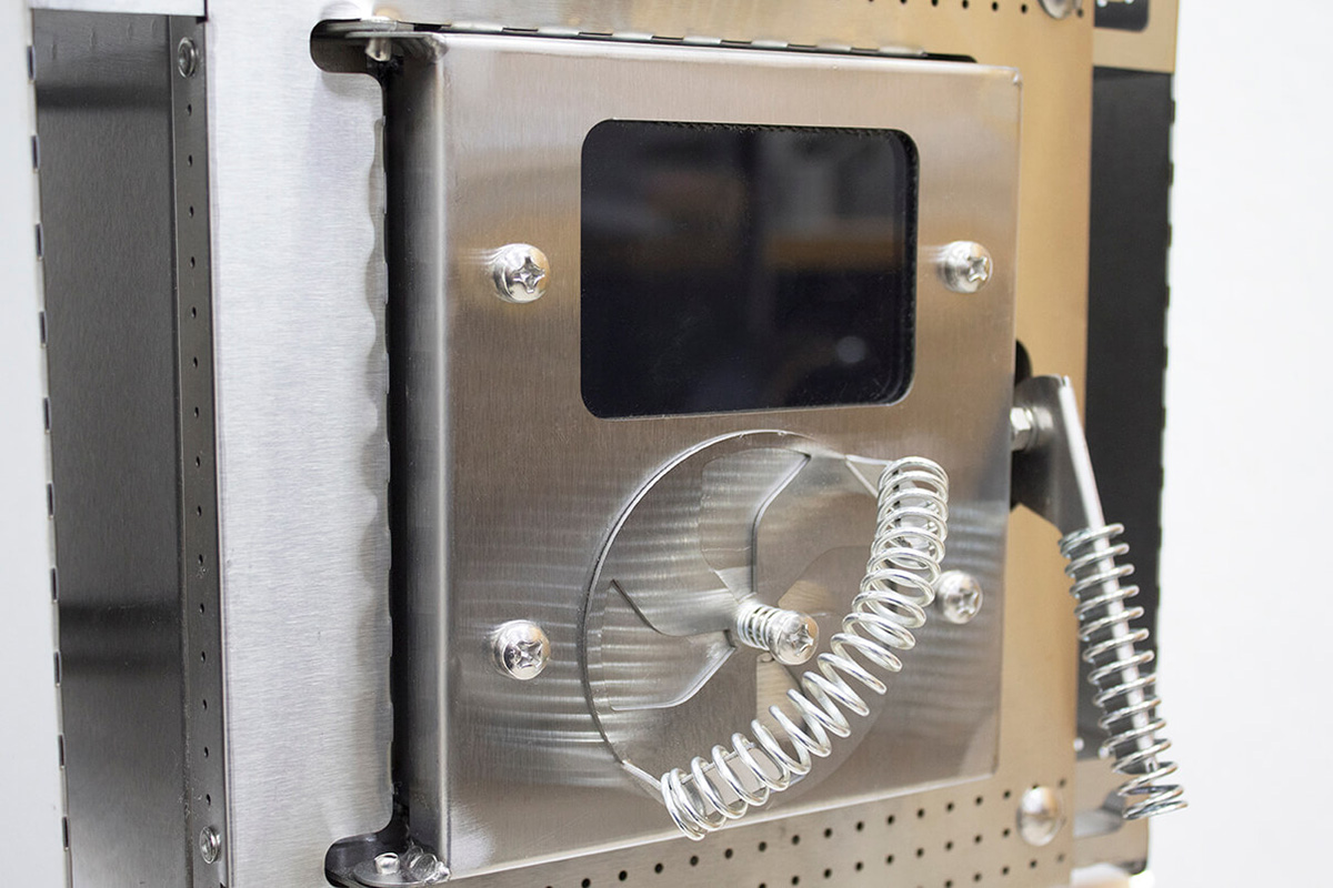 100% герметичность. Топочная дверка закрывается на замок, ее периметр обработан жаростойким уплотнителем. Он не пропускает дым и воздух. Интенсивность горения меняется при помощи направления вращения диска и степени открытия воздухозаборника. Внутренняя сторона обшита металлической сеткой для предотвращения вылетания углей из топки.