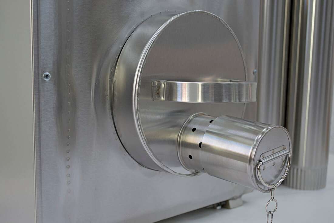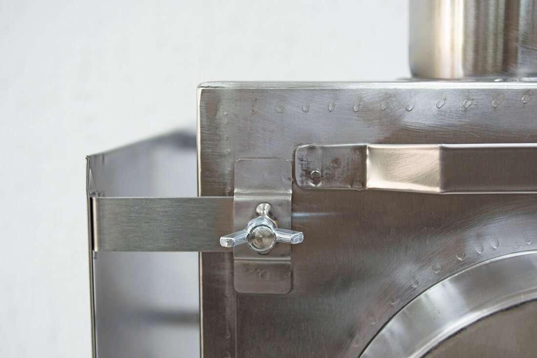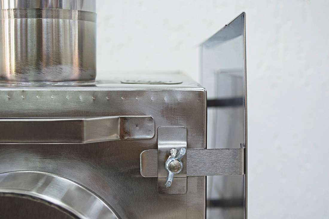 - В нижней части топки под углом 45 градусов установлены две пластины из нержавеющей стали, что способствует интенсивности и длительности горения, так как топливо при сгорании постепенно смещается к центру печи. Также они выполняют роль дополнительных ребер жесткости.