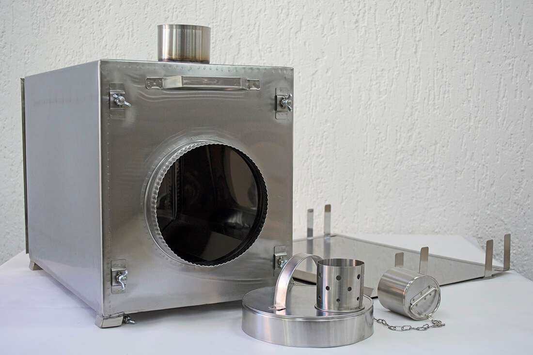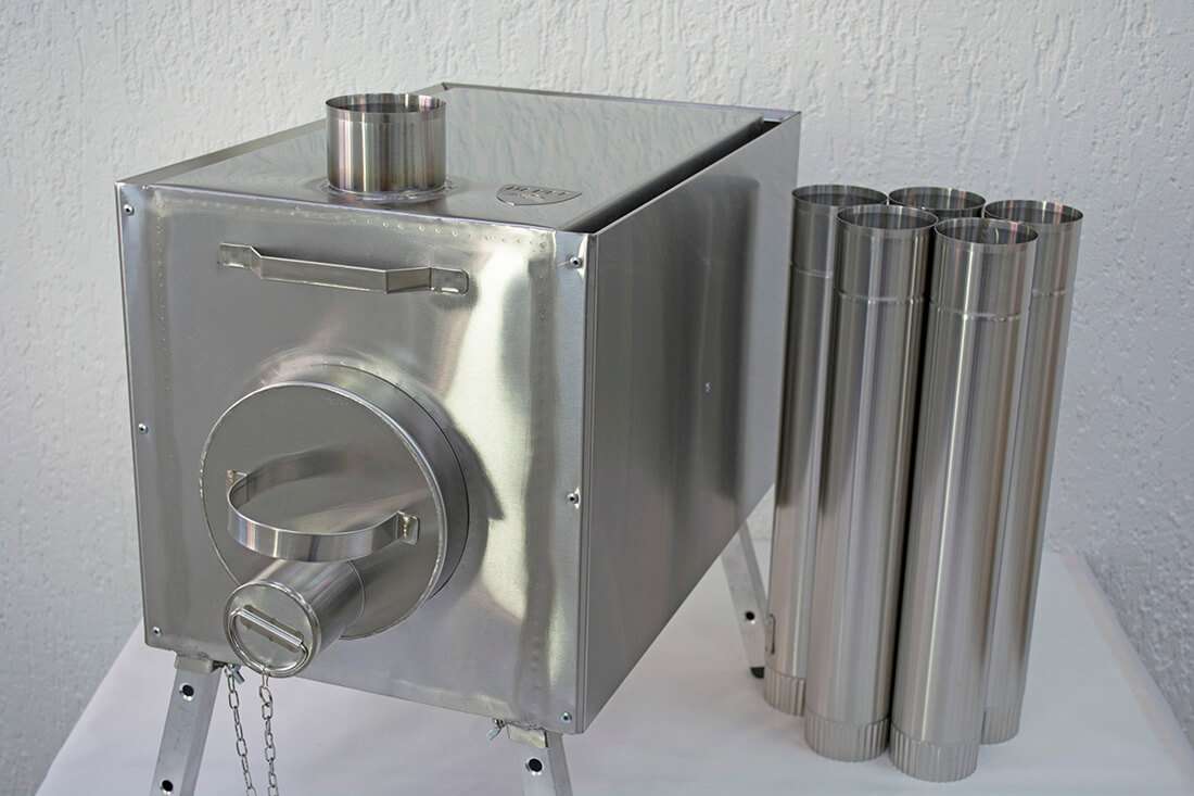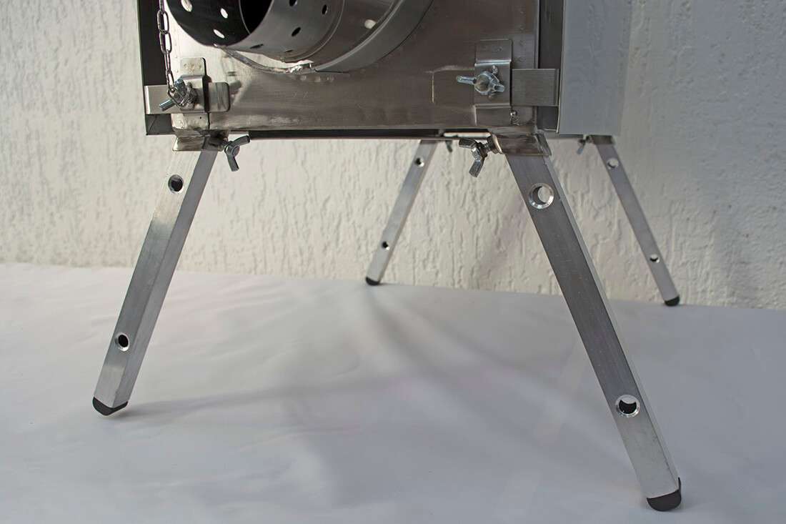 Конструкция печи включает в себя: короб (топочную камеру), искрогаситель, съемную топочную дверцу и стакан для регулирования подачи кислорода, отражающие экраны с 4 сторон, съемные ножки, дымоход.