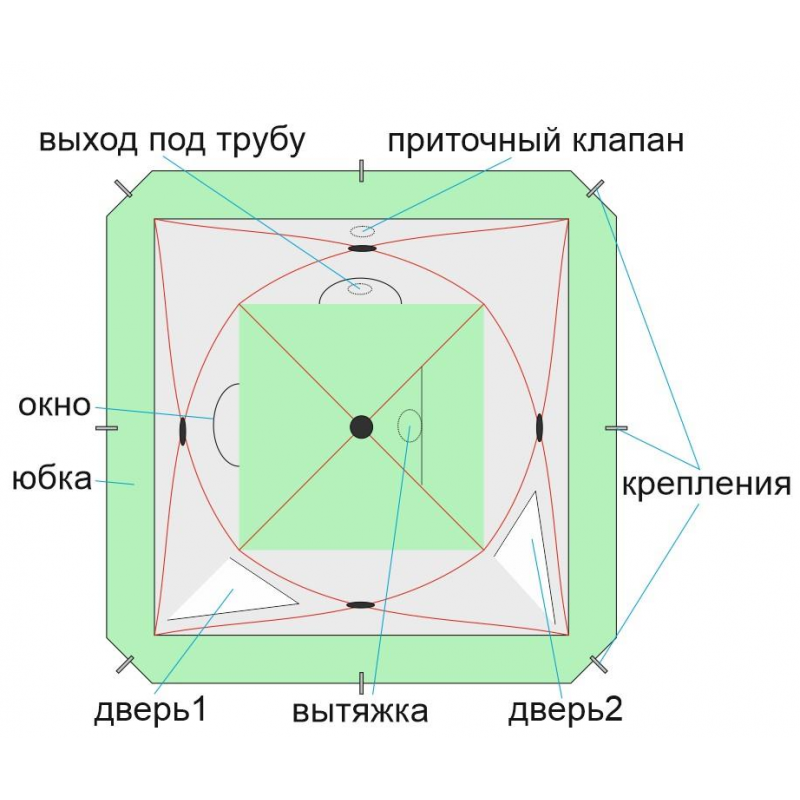Универсальная система креплений внешних съемных элементов в оконных проемах палатки позволяет устанавливать в них дополнительные аксессуары (опции): прозрачное окно, клапан под теплообменник, огнеупорный клапан, противомоскитную сетку;