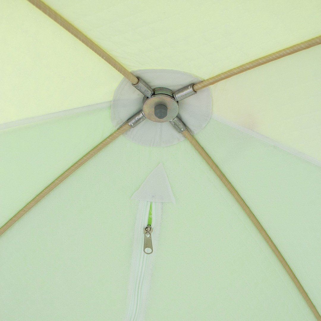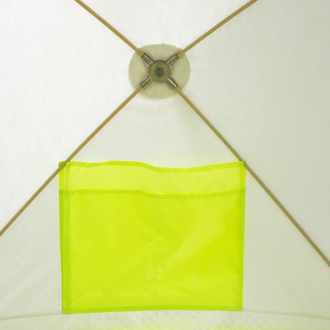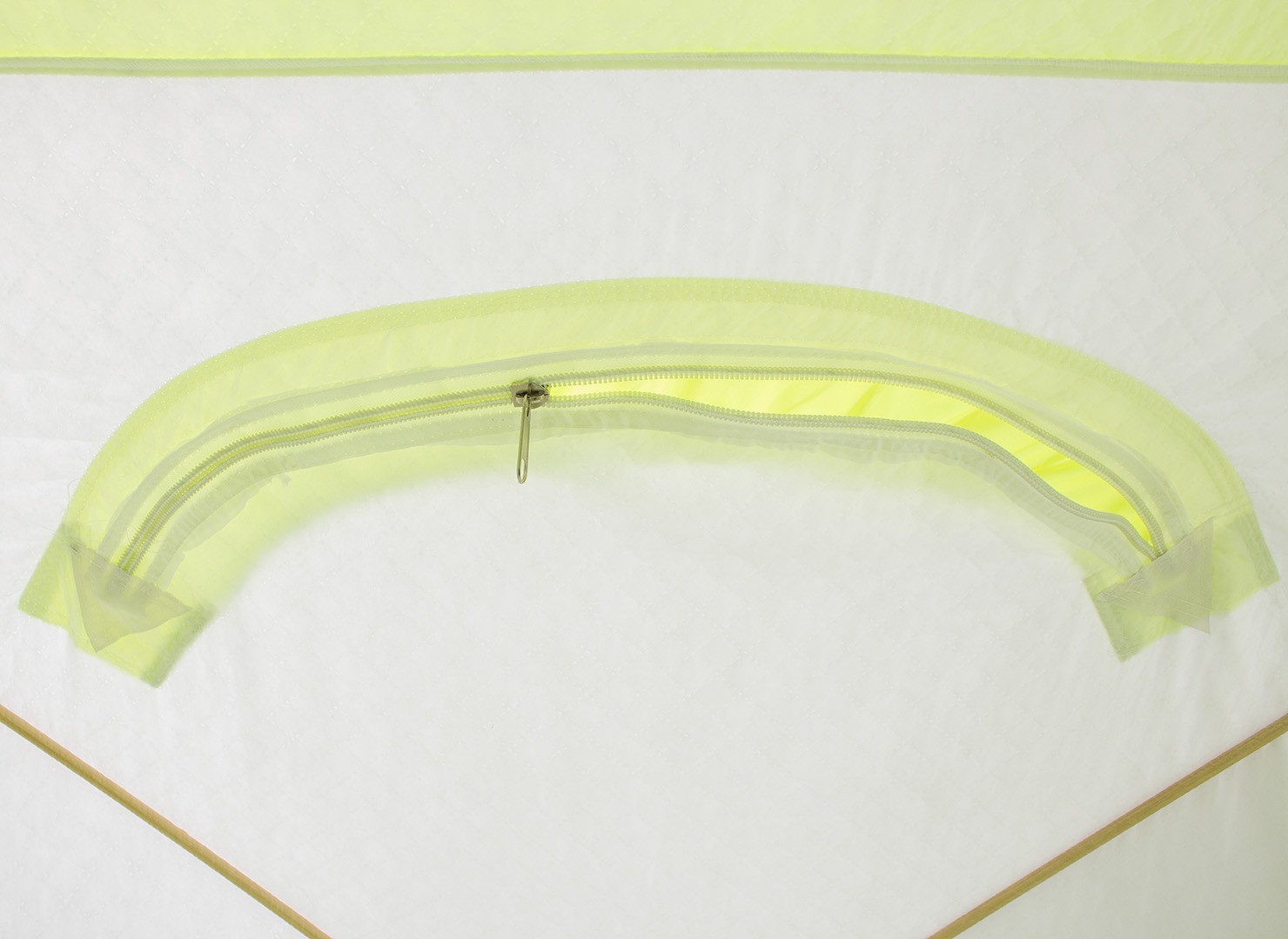 Тент включает три слоя. Снаружи это водонепроницаемый Oxford. Два внутренних слоя выполнены из синтепона и таффеты 190 Т, соединены между собой термостежкой. Предусмотрена юбка для защиты от снега и ветра.