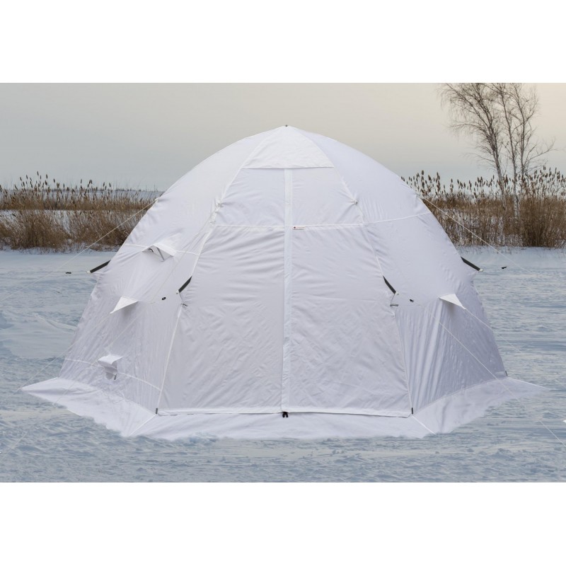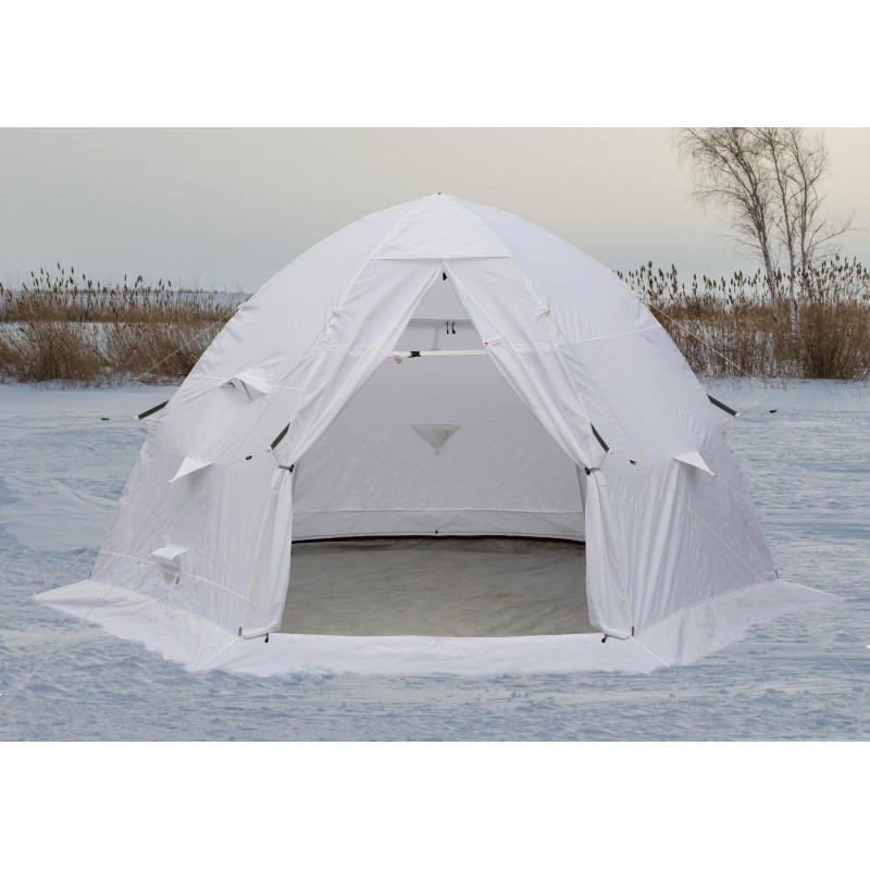 - Основой конструкции палатки теперь является шестигранный каркас, образующий купол. Большой размер не является помехой для эксплуатации её при любой погоде. Для надёжной фиксации на льду она оборудована рядом усиленных креплений. Даже ветра со скоростью 100 км/час не способны стронуть её с места.