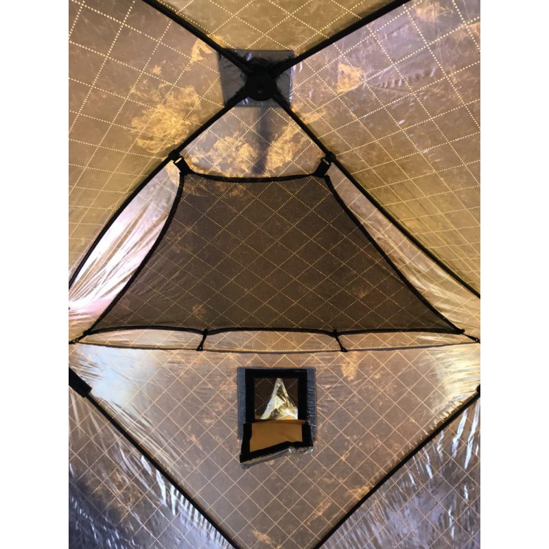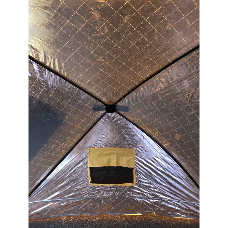 Тент выполнен из трех слоев. Снаружи водостойкий полиэстер, внутри — полиэстер 300 D с термоотражающим покрытием. Между ними находится ветронепроницаемый утеплитель Bonded Polyester. Имеется снежная юбка для создания эффекта пола и попадания внутрь снега, льда, вода.