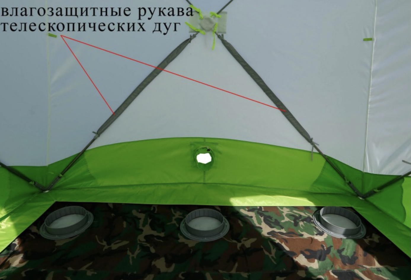 Палатка крепится к гидроизоляционному дну (опция, приобретается отдельно) при помощи петель, которые расположены под внешней юбкой, при этом сама юбка обеспечивает надежную защиту от попадания осадков внутрь «гидро-корыта».