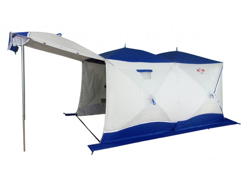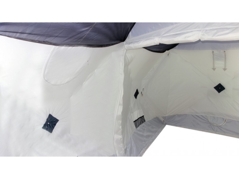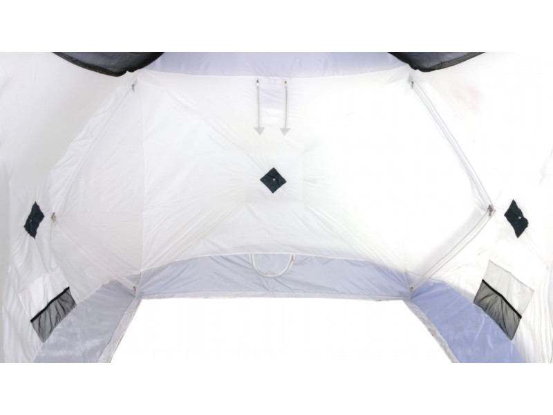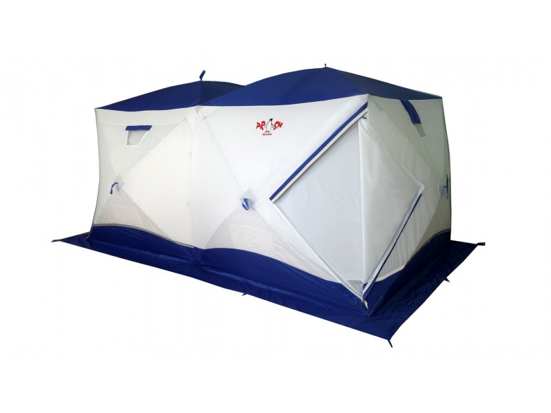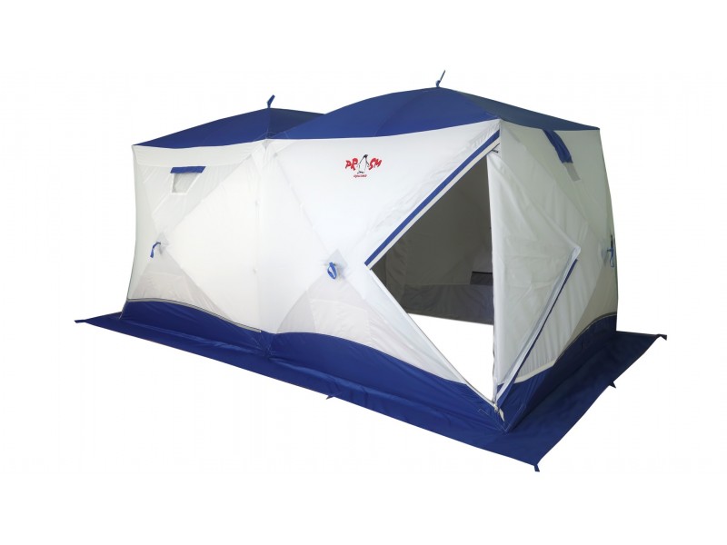 Всесезонная палатка Призма Шелтерс "BIG TWIN" (2-сл.) - новинка сезона! Имеет форму двойного куба, что позволяет организовать базовый лагерь от 4-х человек и при этом рационально использовать пространство. "Big Twin" - это не только укрытие для рыбаков. Благодаря конструкции "Шелтерс", одна из сторон поднимается и становится крышей, тем самым модифицируя палатку в шатер. Летом, установив палатку на берегу водоема, вы находитесь в укрытии и в то же время имеете открытый доступ к воде и абсолютно свободно работаете со снастями. В то же время вещи, прикормка, насадка, снасти - всё находится рядом в укрытии. Размеры "Big Twin" позволяют комфортно расположить вещи и с удобством разместиться самим. Зимой сверлить лунки можно непосредственно в установленной палатке. Несмотря на свои размеры, палатка выдерживает порывистый ветер. Легко ставится в любую погоду. Для удобства в палатке также сделано два входа. Входы сделаны напротив друг друга, что позволяет оптимизировать внутреннее пространство (при этом открывающая сторона находится напротив дверей). Входы с фиксатором – липучкой выполнены в угловом варианте и снабжены специальной зимней молнией, которая снаружи имеет защитную планку, предотвращающую от замерзания. На наружной юбке имеются оттяжки для крепления порогов при отсутствии снега. Тент кроме поднимающейся стороны и двух входов имеет: 3 форточки, выполненных из прозрачной морозостойкой ПВХ-плёнки (одна полностью съёмная), 4 настрочных кармана с сеткой, 4 потолочных кармана-сетки, выход под трубу на липе. Основной цвет белый с цветной крышей и порогами. Снаружи имеются светоотражающие элементы, что очень важно для безопасности на льду в темное время суток.