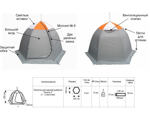 Палатка для рыбалки Омуль-2 от Митек подходит для комфортной зимней рыбалки. Она рассчитана на одного рыбака. Каркас быстроразборный, зонтичного типа. Палатку легко может поставить и собрать 1 человек.
