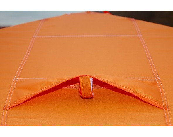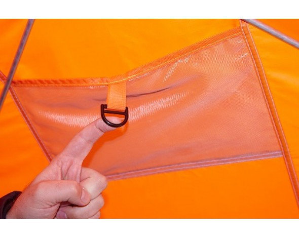 Широкая юбка. Её можно присыпать снегом, чтобы не поддувал ветер. Также она оснащена ушками для дополнительного крепления палатки с помощью ввертышей.