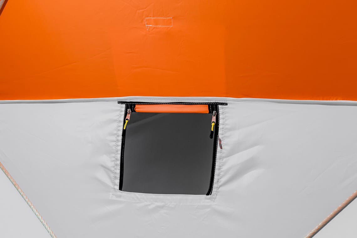 Палатка имеет выход под различные диаметры труб для использования отопительных приборов, окошко для притока воздуха и дополнительное окно на молнии и липучках для дополнительного проветривания или дополнительного света и обзора.