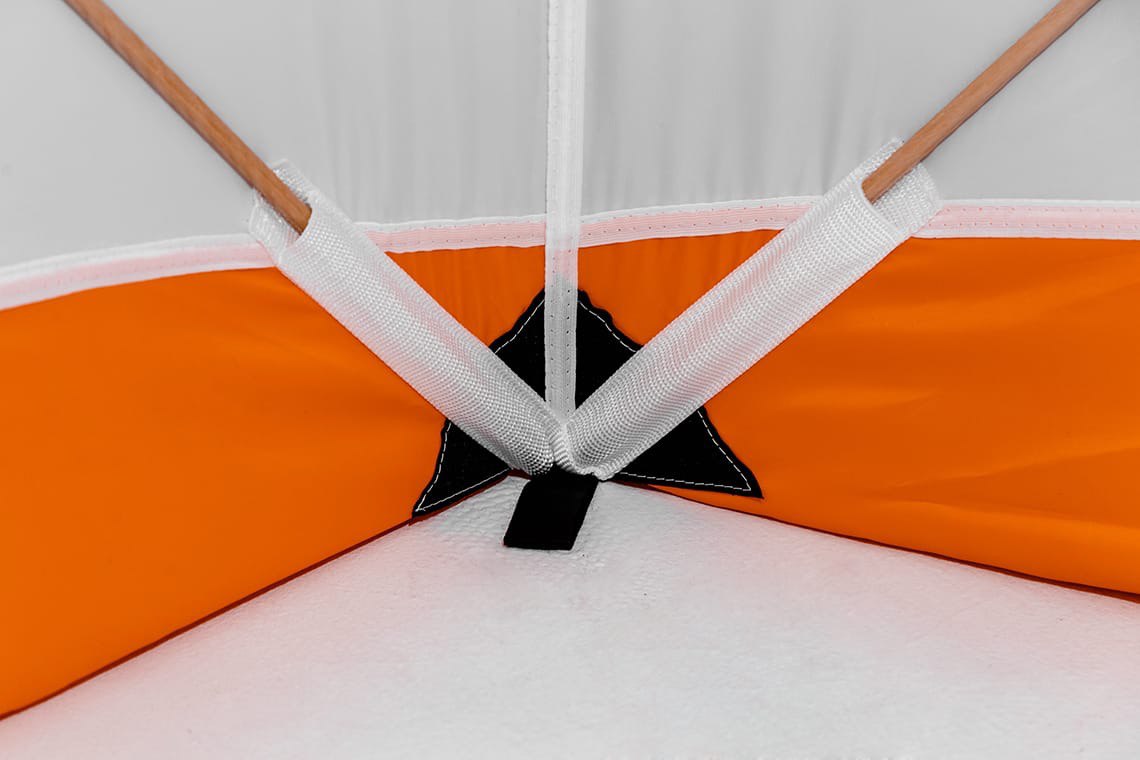 Крепление палатки ко льду предусмотрено не только классическим способом - растяжками от центров граней палатки и по углам юбки, но и в четырёх углах внутри палатки, что обеспечивает 100% устойчивость и надёжность крепления на любых ветрах.