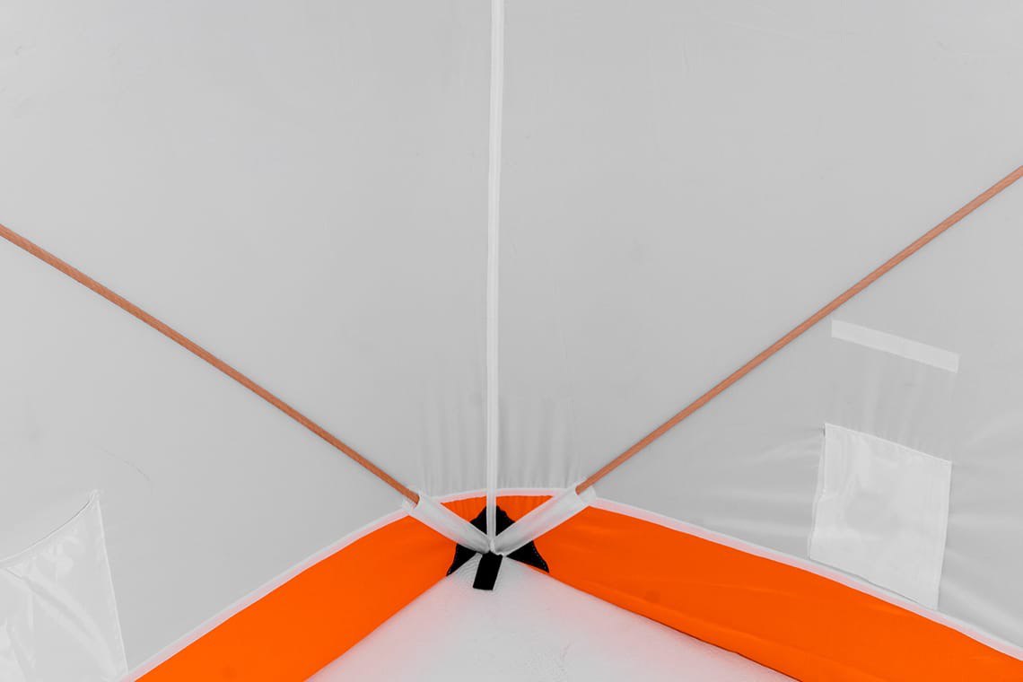 При изготовлении тента этой зимней палатки использована ткань Oxford 240 PU. Тент обладает водоотталкивающими свойствами, удерживает тепло, а белый цвет обеспечивает прекрасную светопроницаемость, что обеспечивает комфортные условия для проведения зимней рыбалки и не даёт глазам уставать.
