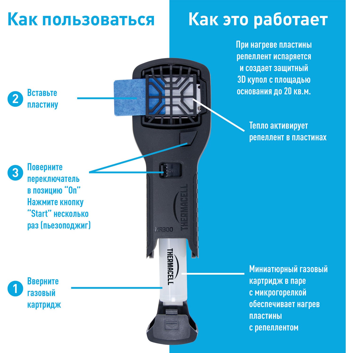 Thermacell настолько прост в использовании, что потребуется всего пара минут, чтобы подготовить его к работе: достаньте прибор, установите газовый картридж и пластину, нажмите на кнопку включения, а затем на кнопку пьезоподжига. В течение 15 минут пластина нагреется, репеллент начнёт испаряться и сформирует невидимый, но вполне реальный защитный барьер, который не подпустит к вам ни одного комара.